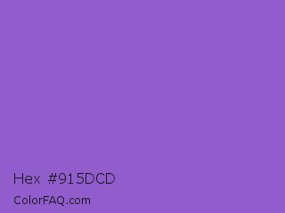 Hex #915dcd Color is a normal violet color and the nearest color is Amethyst #9966cc. Hex code #915dcd and RGB value is rgb(145,93,205). In RGB color space, this color is composed of 57% red, 36% green, 80% blue, In CMYK color space, this color is composed of 29% cyan, 55% magenta, 0% yellow , 20% black , In HSL color space, this color has a hue angle of 268° , 53% saturation and 58% lightness.