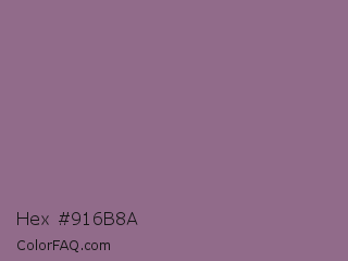 Hex #916b8a Color is a normal magenta color and the nearest color is Strikemaster #956387. Hex code #916b8a and RGB value is rgb(145,107,138). In RGB color space, this color is composed of 57% red, 42% green, 54% blue, In CMYK color space, this color is composed of 0% cyan, 26% magenta, 5% yellow , 43% black , In HSL color space, this color has a hue angle of 311° , 15% saturation and 49% lightness.