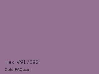 Hex #917092 Color is a normal magenta color and the nearest color is Trendy Pink #8c6495. Hex code #917092 and RGB value is rgb(145,112,146). In RGB color space, this color is composed of 57% red, 44% green, 57% blue, In CMYK color space, this color is composed of 1% cyan, 23% magenta, 0% yellow , 43% black , In HSL color space, this color has a hue angle of 298° , 13% saturation and 51% lightness.