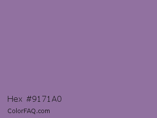 Hex #9171a0 Color is a normal purple color and the nearest color is Trendy Pink #8c6495. Hex code #9171a0 and RGB value is rgb(145,113,160). In RGB color space, this color is composed of 57% red, 44% green, 63% blue, In CMYK color space, this color is composed of 9% cyan, 29% magenta, 0% yellow , 37% black , In HSL color space, this color has a hue angle of 281° , 20% saturation and 54% lightness.