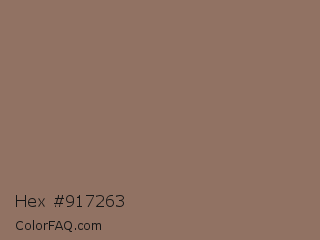 Hex #917263 Color is a normal orange color and the nearest color is Cement #8d7662. Hex code #917263 and RGB value is rgb(145,114,99). In RGB color space, this color is composed of 57% red, 45% green, 39% blue, In CMYK color space, this color is composed of 0% cyan, 21% magenta, 32% yellow , 43% black , In HSL color space, this color has a hue angle of 20° , 19% saturation and 48% lightness.