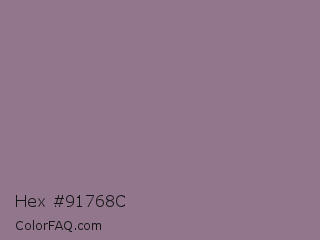 Hex #91768c Color is a normal magenta color and the nearest color is Mountbatten Pink #997a8d. Hex code #91768c and RGB value is rgb(145,118,140). In RGB color space, this color is composed of 57% red, 46% green, 55% blue, In CMYK color space, this color is composed of 0% cyan, 19% magenta, 3% yellow , 43% black , In HSL color space, this color has a hue angle of 311° , 11% saturation and 52% lightness.