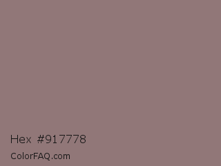 Hex #917778 Color is a normal red color and the nearest color is Hemp #907874. Hex code #917778 and RGB value is rgb(145,119,120). In RGB color space, this color is composed of 57% red, 47% green, 47% blue, In CMYK color space, this color is composed of 0% cyan, 18% magenta, 17% yellow , 43% black , In HSL color space, this color has a hue angle of 358° , 11% saturation and 52% lightness.