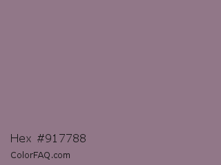 Hex #917788 Color is a normal magenta color and the nearest color is Mountbatten Pink #997a8d. Hex code #917788 and RGB value is rgb(145,119,136). In RGB color space, this color is composed of 57% red, 47% green, 53% blue, In CMYK color space, this color is composed of 0% cyan, 18% magenta, 6% yellow , 43% black , In HSL color space, this color has a hue angle of 321° , 11% saturation and 52% lightness.