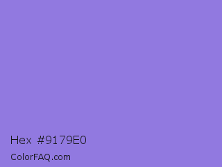 Hex #9179e0 Color is a light indigo color and the nearest color is Medium Purple #9370db. Hex code #9179e0 and RGB value is rgb(145,121,224). In RGB color space, this color is composed of 57% red, 47% green, 88% blue, In CMYK color space, this color is composed of 35% cyan, 46% magenta, 0% yellow , 12% black , In HSL color space, this color has a hue angle of 254° , 62% saturation and 68% lightness.