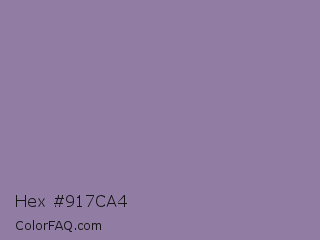 Hex #917ca4 Color is a normal purple color and the nearest color is Lavender Purple #967bb6. Hex code #917ca4 and RGB value is rgb(145,124,164). In RGB color space, this color is composed of 57% red, 49% green, 64% blue, In CMYK color space, this color is composed of 12% cyan, 24% magenta, 0% yellow , 36% black , In HSL color space, this color has a hue angle of 272° , 18% saturation and 56% lightness.
