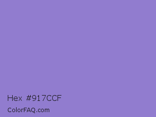 Hex #917ccf Color is a light indigo color and the nearest color is Lilac Bush #9874d3. Hex code #917ccf and RGB value is rgb(145,124,207). In RGB color space, this color is composed of 57% red, 49% green, 81% blue, In CMYK color space, this color is composed of 30% cyan, 40% magenta, 0% yellow , 19% black , In HSL color space, this color has a hue angle of 255° , 46% saturation and 65% lightness.