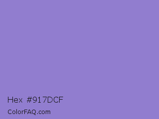 Hex #917dcf Color is a light indigo color and the nearest color is Lilac Bush #9874d3. Hex code #917dcf and RGB value is rgb(145,125,207). In RGB color space, this color is composed of 57% red, 49% green, 81% blue, In CMYK color space, this color is composed of 30% cyan, 40% magenta, 0% yellow , 19% black , In HSL color space, this color has a hue angle of 255° , 46% saturation and 65% lightness.