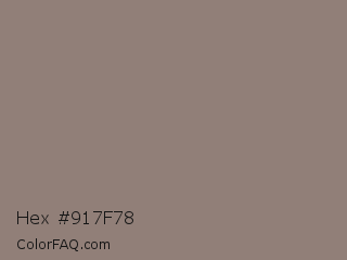 Hex #917f78 Color is a normal orange color and the nearest color is Squirrel #8f8176. Hex code #917f78 and RGB value is rgb(145,127,120). In RGB color space, this color is composed of 57% red, 50% green, 47% blue, In CMYK color space, this color is composed of 0% cyan, 12% magenta, 17% yellow , 43% black , In HSL color space, this color has a hue angle of 17° , 10% saturation and 52% lightness.