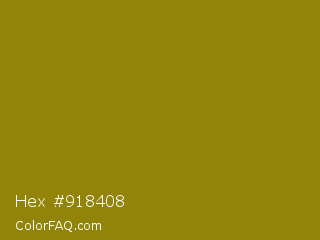 Hex #918408 Color is a dark yellow color and the nearest color is Dark Yellow #9b870c. Hex code #918408 and RGB value is rgb(145,132,8). In RGB color space, this color is composed of 57% red, 52% green, 3% blue, In CMYK color space, this color is composed of 0% cyan, 9% magenta, 94% yellow , 43% black , In HSL color space, this color has a hue angle of 54° , 90% saturation and 30% lightness.