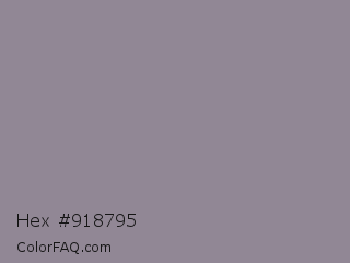Hex #918795 Color is a normal purple color and the nearest color is Venus #928590. Hex code #918795 and RGB value is rgb(145,135,149). In RGB color space, this color is composed of 57% red, 53% green, 58% blue, In CMYK color space, this color is composed of 3% cyan, 9% magenta, 0% yellow , 42% black , In HSL color space, this color has a hue angle of 283° , 6% saturation and 56% lightness.