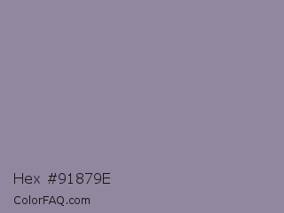 Hex #91879e Color is a normal violet color and the nearest color is Manatee Crayola #8d90a1. Hex code #91879e and RGB value is rgb(145,135,158). In RGB color space, this color is composed of 57% red, 53% green, 62% blue, In CMYK color space, this color is composed of 8% cyan, 15% magenta, 0% yellow , 38% black , In HSL color space, this color has a hue angle of 266° , 11% saturation and 57% lightness.