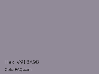 Hex #918a98 Color is a normal violet color and the nearest color is Venus #928590. Hex code #918a98 and RGB value is rgb(145,138,152). In RGB color space, this color is composed of 57% red, 54% green, 60% blue, In CMYK color space, this color is composed of 5% cyan, 9% magenta, 0% yellow , 40% black , In HSL color space, this color has a hue angle of 270° , 6% saturation and 57% lightness.