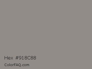Hex #918c88 Color is a normal orange color and the nearest color is Stack #8a8f8a. Hex code #918c88 and RGB value is rgb(145,140,136). In RGB color space, this color is composed of 57% red, 55% green, 53% blue, In CMYK color space, this color is composed of 0% cyan, 3% magenta, 6% yellow , 43% black , In HSL color space, this color has a hue angle of 27° , 4% saturation and 55% lightness.