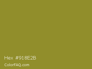 Hex #918e2b Color is a normal yellow color and the nearest color is Sycamore #908d39. Hex code #918e2b and RGB value is rgb(145,142,43). In RGB color space, this color is composed of 57% red, 56% green, 17% blue, In CMYK color space, this color is composed of 0% cyan, 2% magenta, 70% yellow , 43% black , In HSL color space, this color has a hue angle of 58° , 54% saturation and 37% lightness.