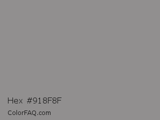 Hex #918f8f Color is a normal red color and the nearest color is Stack #8a8f8a. Hex code #918f8f and RGB value is rgb(145,143,143). In RGB color space, this color is composed of 57% red, 56% green, 56% blue, In CMYK color space, this color is composed of 0% cyan, 1% magenta, 1% yellow , 43% black , In HSL color space, this color has a hue angle of 0° , 1% saturation and 56% lightness.