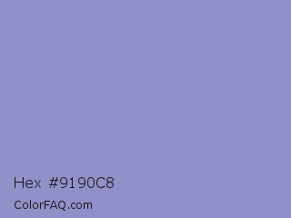Hex #9190c8 Color is a light indigo color and the nearest color is Blue Bell Crayola #9999cc. Hex code #9190c8 and RGB value is rgb(145,144,200). In RGB color space, this color is composed of 57% red, 56% green, 78% blue, In CMYK color space, this color is composed of 28% cyan, 28% magenta, 0% yellow , 22% black , In HSL color space, this color has a hue angle of 241° , 34% saturation and 67% lightness.