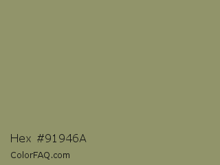 Hex #91946a Color is a normal yellow color and the nearest color is Avocado Pulp #888d65. Hex code #91946a and RGB value is rgb(145,148,106). In RGB color space, this color is composed of 57% red, 58% green, 42% blue, In CMYK color space, this color is composed of 2% cyan, 0% magenta, 28% yellow , 42% black , In HSL color space, this color has a hue angle of 64° , 17% saturation and 50% lightness.