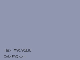 Hex #9196b0 Color is a light blue color and the nearest color is Cool Grey #8c92ac. Hex code #9196b0 and RGB value is rgb(145,150,176). In RGB color space, this color is composed of 57% red, 59% green, 69% blue, In CMYK color space, this color is composed of 18% cyan, 15% magenta, 0% yellow , 31% black , In HSL color space, this color has a hue angle of 230° , 16% saturation and 63% lightness.