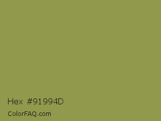 Hex #91994d Color is a normal yellow color and the nearest color is Moss Green #8a9a5b. Hex code #91994d and RGB value is rgb(145,153,77). In RGB color space, this color is composed of 57% red, 60% green, 30% blue, In CMYK color space, this color is composed of 5% cyan, 0% magenta, 50% yellow , 40% black , In HSL color space, this color has a hue angle of 66° , 33% saturation and 45% lightness.