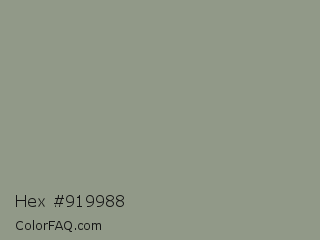 Hex #919988 Color is a normal green color and the nearest color is Mantle #8b9c90. Hex code #919988 and RGB value is rgb(145,153,136). In RGB color space, this color is composed of 57% red, 60% green, 53% blue, In CMYK color space, this color is composed of 5% cyan, 0% magenta, 11% yellow , 40% black , In HSL color space, this color has a hue angle of 88° , 8% saturation and 57% lightness.