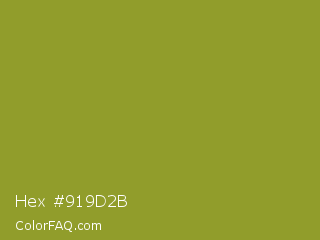 Hex #919d2b Color is a normal yellow color and the nearest color is Sycamore #908d39. Hex code #919d2b and RGB value is rgb(145,157,43). In RGB color space, this color is composed of 57% red, 62% green, 17% blue, In CMYK color space, this color is composed of 8% cyan, 0% magenta, 73% yellow , 38% black , In HSL color space, this color has a hue angle of 66° , 57% saturation and 39% lightness.