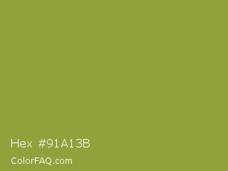Hex #91a13b Color is a normal yellow color and the nearest color is Sushi #87ab39. Hex code #91a13b and RGB value is rgb(145,161,59). In RGB color space, this color is composed of 57% red, 63% green, 23% blue, In CMYK color space, this color is composed of 10% cyan, 0% magenta, 63% yellow , 37% black , In HSL color space, this color has a hue angle of 69° , 46% saturation and 43% lightness.