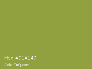 Hex #91a140 Color is a normal yellow color and the nearest color is Sushi #87ab39. Hex code #91a140 and RGB value is rgb(145,161,64). In RGB color space, this color is composed of 57% red, 63% green, 25% blue, In CMYK color space, this color is composed of 10% cyan, 0% magenta, 60% yellow , 37% black , In HSL color space, this color has a hue angle of 70° , 43% saturation and 44% lightness.