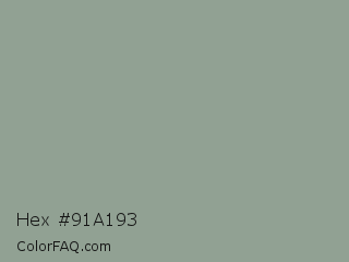 Hex #91a193 Color is a normal green color and the nearest color is Morning Blue #8da399. Hex code #91a193 and RGB value is rgb(145,161,147). In RGB color space, this color is composed of 57% red, 63% green, 58% blue, In CMYK color space, this color is composed of 10% cyan, 0% magenta, 9% yellow , 37% black , In HSL color space, this color has a hue angle of 128° , 8% saturation and 60% lightness.