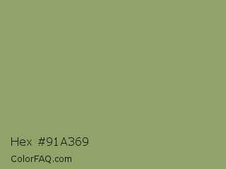 Hex #91a369 Color is a normal lime color and the nearest color is Asparagus #87a96b. Hex code #91a369 and RGB value is rgb(145,163,105). In RGB color space, this color is composed of 57% red, 64% green, 41% blue, In CMYK color space, this color is composed of 11% cyan, 0% magenta, 36% yellow , 36% black , In HSL color space, this color has a hue angle of 79° , 24% saturation and 53% lightness.