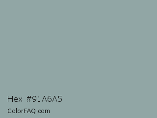 Hex #91a6a5 Color is a light cyan color and the nearest color is Cascade #8ba9a5. Hex code #91a6a5 and RGB value is rgb(145,166,165). In RGB color space, this color is composed of 57% red, 65% green, 65% blue, In CMYK color space, this color is composed of 13% cyan, 0% magenta, 1% yellow , 35% black , In HSL color space, this color has a hue angle of 177° , 11% saturation and 61% lightness.