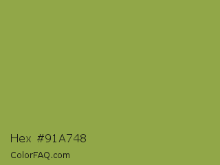 Hex #91a748 Color is a normal lime color and the nearest color is Sushi #87ab39. Hex code #91a748 and RGB value is rgb(145,167,72). In RGB color space, this color is composed of 57% red, 65% green, 28% blue, In CMYK color space, this color is composed of 13% cyan, 0% magenta, 57% yellow , 35% black , In HSL color space, this color has a hue angle of 74° , 40% saturation and 47% lightness.
