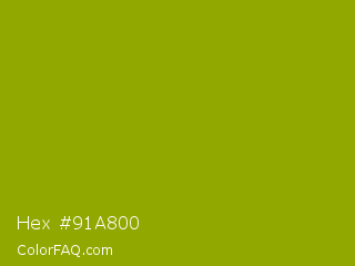 Hex #91a800 Color is a normal yellow color and the nearest color is Apple Green #8db600. Hex code #91a800 and RGB value is rgb(145,168,0). In RGB color space, this color is composed of 57% red, 66% green, 0% blue, In CMYK color space, this color is composed of 14% cyan, 0% magenta, 100% yellow , 34% black , In HSL color space, this color has a hue angle of 68° , 100% saturation and 33% lightness.
