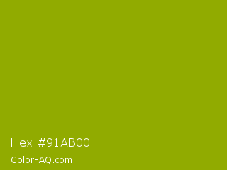 Hex #91ab00 Color is a normal yellow color and the nearest color is Apple Green #8db600. Hex code #91ab00 and RGB value is rgb(145,171,0). In RGB color space, this color is composed of 57% red, 67% green, 0% blue, In CMYK color space, this color is composed of 15% cyan, 0% magenta, 100% yellow , 33% black , In HSL color space, this color has a hue angle of 69° , 100% saturation and 34% lightness.