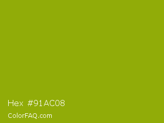 Hex #91ac08 Color is a normal yellow color and the nearest color is Apple Green #8db600. Hex code #91ac08 and RGB value is rgb(145,172,8). In RGB color space, this color is composed of 57% red, 67% green, 3% blue, In CMYK color space, this color is composed of 16% cyan, 0% magenta, 95% yellow , 33% black , In HSL color space, this color has a hue angle of 70° , 91% saturation and 35% lightness.