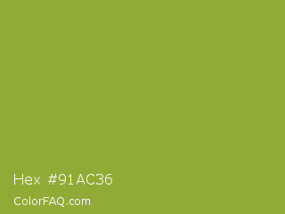 Hex #91ac36 Color is a normal lime color and the nearest color is Sushi #87ab39. Hex code #91ac36 and RGB value is rgb(145,172,54). In RGB color space, this color is composed of 57% red, 67% green, 21% blue, In CMYK color space, this color is composed of 16% cyan, 0% magenta, 69% yellow , 33% black , In HSL color space, this color has a hue angle of 74° , 52% saturation and 44% lightness.