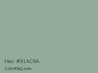 Hex #91ac9a Color is a light green color and the nearest color is Pewter #96a8a1. Hex code #91ac9a and RGB value is rgb(145,172,154). In RGB color space, this color is composed of 57% red, 67% green, 60% blue, In CMYK color space, this color is composed of 16% cyan, 0% magenta, 10% yellow , 33% black , In HSL color space, this color has a hue angle of 140° , 14% saturation and 62% lightness.