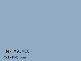 Hex #91acc4 Color is a light blue color and the nearest color is Nepal #8eabc1. Hex code #91acc4 and RGB value is rgb(145,172,196). In RGB color space, this color is composed of 57% red, 67% green, 77% blue, In CMYK color space, this color is composed of 26% cyan, 12% magenta, 0% yellow , 23% black , In HSL color space, this color has a hue angle of 208° , 30% saturation and 67% lightness.