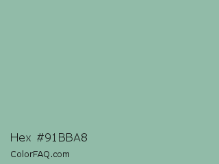 Hex #91bba8 Color is a light green color and the nearest color is Summer Green #96bbab. Hex code #91bba8 and RGB value is rgb(145,187,168). In RGB color space, this color is composed of 57% red, 73% green, 66% blue, In CMYK color space, this color is composed of 22% cyan, 0% magenta, 10% yellow , 27% black , In HSL color space, this color has a hue angle of 153° , 24% saturation and 65% lightness.