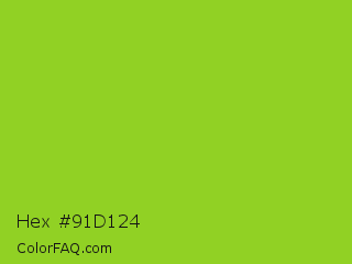 Hex #91d124 Color is a normal green color and the nearest color is Atlantis #97cd2d. Hex code #91d124 and RGB value is rgb(145,209,36). In RGB color space, this color is composed of 57% red, 82% green, 14% blue, In CMYK color space, this color is composed of 31% cyan, 0% magenta, 83% yellow , 18% black , In HSL color space, this color has a hue angle of 82° , 71% saturation and 48% lightness.