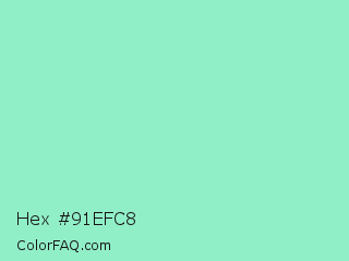 Hex #91efc8 Color is a light green color and the nearest color is Riptide #8be6d8. Hex code #91efc8 and RGB value is rgb(145,239,200). In RGB color space, this color is composed of 57% red, 94% green, 78% blue, In CMYK color space, this color is composed of 39% cyan, 0% magenta, 16% yellow , 6% black , In HSL color space, this color has a hue angle of 155° , 75% saturation and 75% lightness.
