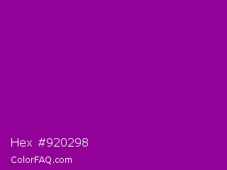 Hex #920298 Color is a dark magenta color and the nearest color is Dark Magenta #8b008b. Hex code #920298 and RGB value is rgb(146,2,152). In RGB color space, this color is composed of 57% red, 1% green, 60% blue, In CMYK color space, this color is composed of 4% cyan, 99% magenta, 0% yellow , 40% black , In HSL color space, this color has a hue angle of 298° , 97% saturation and 30% lightness.
