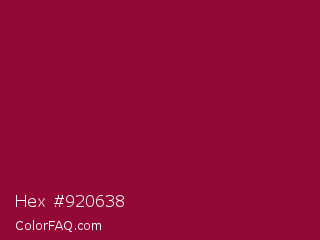 Hex #920638 Color is a dark rose color and the nearest color is Pink Raspberry #980036. Hex code #920638 and RGB value is rgb(146,6,56). In RGB color space, this color is composed of 57% red, 2% green, 22% blue, In CMYK color space, this color is composed of 0% cyan, 96% magenta, 62% yellow , 43% black , In HSL color space, this color has a hue angle of 339° , 92% saturation and 30% lightness.