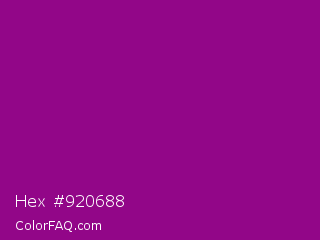 Hex #920688 Color is a dark magenta color and the nearest color is Dark Magenta #8b008b. Hex code #920688 and RGB value is rgb(146,6,136). In RGB color space, this color is composed of 57% red, 2% green, 53% blue, In CMYK color space, this color is composed of 0% cyan, 96% magenta, 7% yellow , 43% black , In HSL color space, this color has a hue angle of 304° , 92% saturation and 30% lightness.