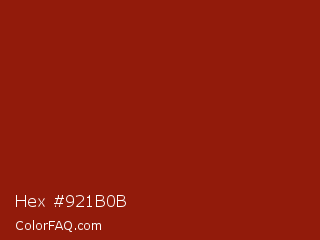 Hex #921b0b Color is a normal red color and the nearest color is Totem Pole #991b07. Hex code #921b0b and RGB value is rgb(146,27,11). In RGB color space, this color is composed of 57% red, 11% green, 4% blue, In CMYK color space, this color is composed of 0% cyan, 82% magenta, 92% yellow , 43% black , In HSL color space, this color has a hue angle of 7° , 86% saturation and 31% lightness.