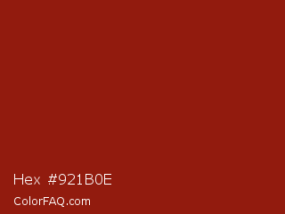 Hex #921b0e Color is a normal red color and the nearest color is Totem Pole #991b07. Hex code #921b0e and RGB value is rgb(146,27,14). In RGB color space, this color is composed of 57% red, 11% green, 5% blue, In CMYK color space, this color is composed of 0% cyan, 82% magenta, 90% yellow , 43% black , In HSL color space, this color has a hue angle of 6° , 83% saturation and 31% lightness.