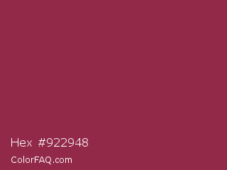Hex #922948 Color is a normal rose color and the nearest color is Big Dip O Ruby #9c2542. Hex code #922948 and RGB value is rgb(146,41,72). In RGB color space, this color is composed of 57% red, 16% green, 28% blue, In CMYK color space, this color is composed of 0% cyan, 72% magenta, 51% yellow , 43% black , In HSL color space, this color has a hue angle of 342° , 56% saturation and 37% lightness.