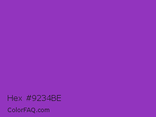 Hex #9234be Color is a normal purple color and the nearest color is Dark Orchid #9932cc. Hex code #9234be and RGB value is rgb(146,52,190). In RGB color space, this color is composed of 57% red, 20% green, 75% blue, In CMYK color space, this color is composed of 23% cyan, 73% magenta, 0% yellow , 25% black , In HSL color space, this color has a hue angle of 281° , 57% saturation and 47% lightness.
