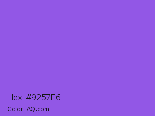 Hex #9257e6 Color is a light violet color and the nearest color is Navy Purple #9457eb. Hex code #9257e6 and RGB value is rgb(146,87,230). In RGB color space, this color is composed of 57% red, 34% green, 90% blue, In CMYK color space, this color is composed of 37% cyan, 62% magenta, 0% yellow , 10% black , In HSL color space, this color has a hue angle of 265° , 74% saturation and 62% lightness.