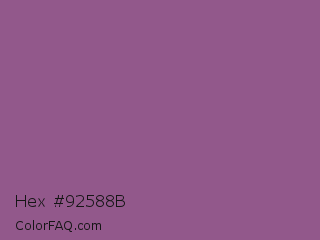 Hex #92588b Color is a normal magenta color and the nearest color is Antique Fuchsia #915c83. Hex code #92588b and RGB value is rgb(146,88,139). In RGB color space, this color is composed of 57% red, 35% green, 55% blue, In CMYK color space, this color is composed of 0% cyan, 40% magenta, 5% yellow , 43% black , In HSL color space, this color has a hue angle of 307° , 25% saturation and 46% lightness.